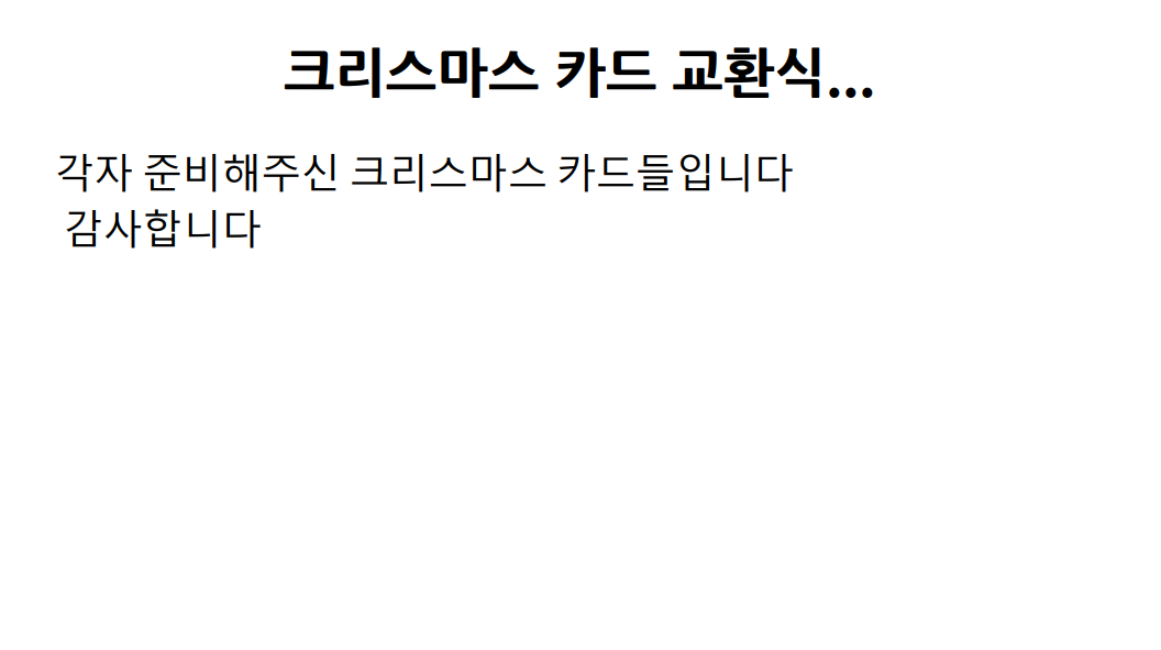 정말 추운 서울에서의 토요일 밤이었는데 굉장히 뜻깊은 마무리가 되었던 거 같고, 멀리서도 와주신분들이 계셔서 정말 감사하다는 생각이 들었다. 또 크리스마스 카드를 서로 써와서 랜덤으로 교환을 하는 시간도 있었는데 다들 정말 열심히 써오시고 이거는 내년에도 조금 더 잘 준비를 해서 잘 해보고 싶다는 생각이 들었다.