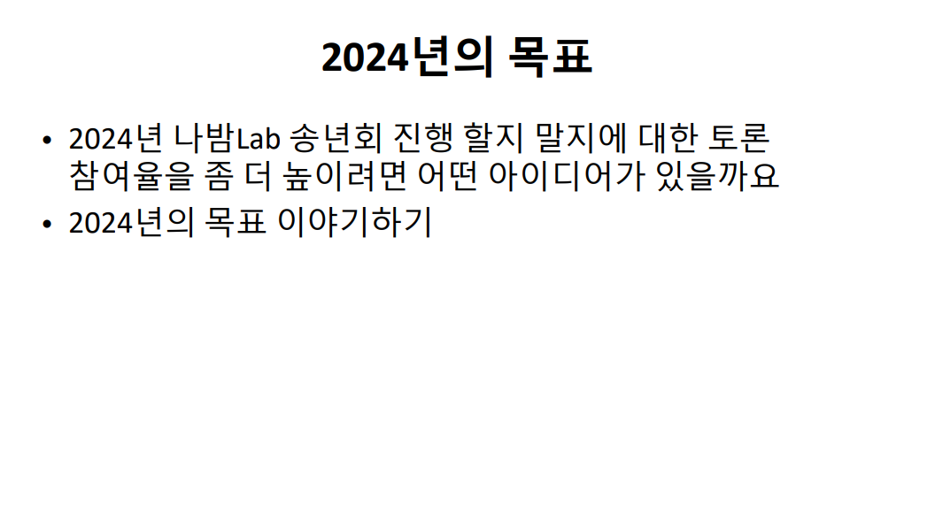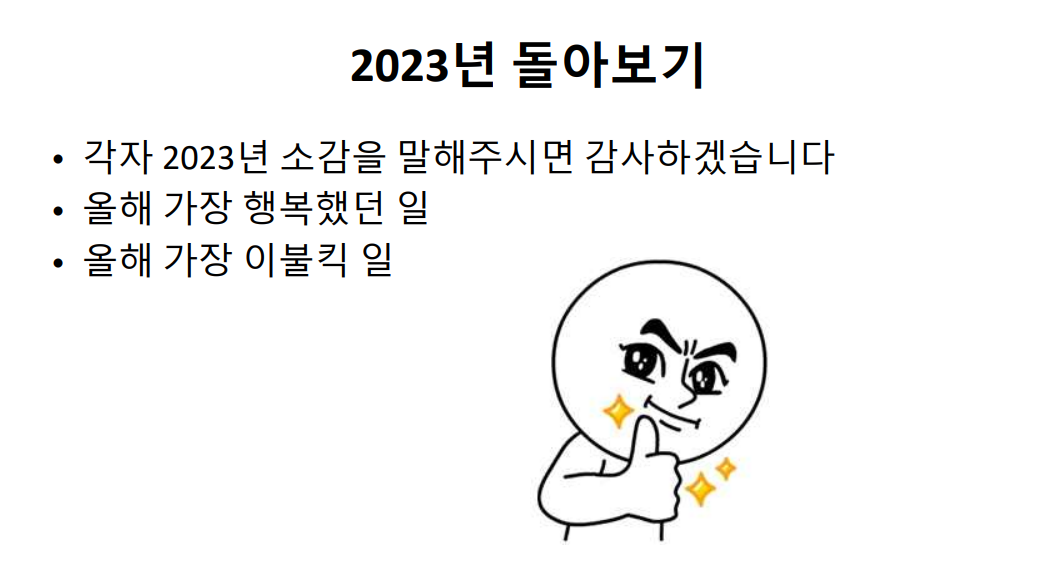 이런식으로 진행이 되었고, 주된 골자는 2023년을 한 번 다같이 돌아보고 어떤 일들이 있었고 2024년은 어떤 목표를 잡을지에 대한 얘기들을 많이 했는데 올해는 아무래도 전반적으로 다들 그렇게 좋지만은 않은 해였다고 다들 얘기를 했었다. 그래서 2024년에 관한 목표에 대해서 서로 이야기들을 나눴었는데 내 얘기부터 하자면 나는 2023년에서 가장 행복했던 일을 T1이 드디어 롤드컵을 우승할 수 있었던게 가장 기억에 남았다고 말을 했고 2024년에는 결혼은 아니더라도 배우자가 될 사람을 찾을 수 있으면 좋겠다 라고 말을 했다. 이제 다른 친구들이 말을 했던 목표들을 정리를 해볼건데 편의상 닉네임으로 그냥 목표들을 정리 해보겠습니다.