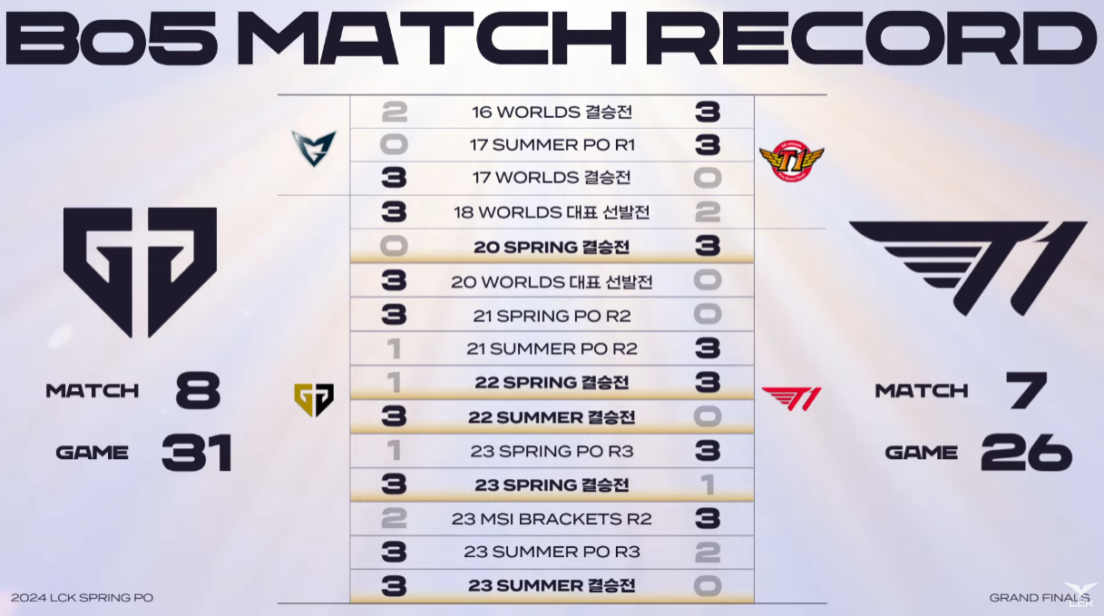 24년 4월 14일 lck spring 결승전이 끝났다. 결과는 GenG가 3:2로 T1을 승리하게 되었는데 솔직히 이번 스프링 시즌 전체로 놓고 봤을때는 젠지가 우승할 것이라는것에 대해서 이견이 없었고 티원은 한화와의 플레이오프에서도 3:0으로 패배했었어서 그때만해도 티원은 이번에 결승전에 가지도 못할것이라는 의견들이 많았다. 나 또한 그랬다. 그냥 놓아주고 써머 에는 좀 더 잘했으면 좋겠다 라는 생각을 했으나 티원이 한화를 결승 결정전에서 3:1로 이기고 오늘 결승전에 오게 되었다. 그래서 오히려 결승전 전에는 티원이 혹시나...? 언더독의 입장에서 무언가를 보여주나 라고 기대를 많이 했는데 이제 결과를 알게 되고 보니 티원도 굉장히 잘했지만 젠지도 정말 탄탄하게 준비를 잘 해왔고 스포츠 경기를 보다보면 흐름이라는게 많이 중요하다고 느끼는데 4경기까지도 티원이 흐름이 좀 더 좋았었다고 생각을 하는데 균열이 났었던 시점이 있었다.