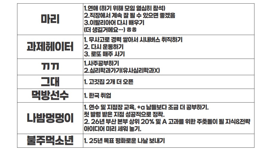 | 11. 카를로스 | 1. 직장에서 빠지면 안 되는 사람 되기 2. 학원, 출판사 확장하기 3. 다이어트 하기 4. 해외여행 가기 5. 행복해지기 |