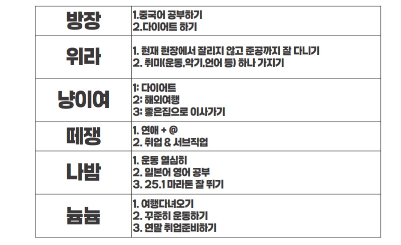 | 1. 나밤부활희망자 | 1. 연애 이어가기 2. 하프마라톤 3개 완주하기 3. 회사 안짤리기 |