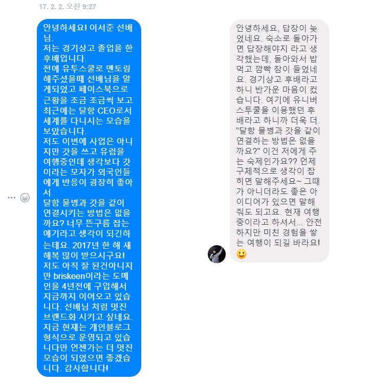 필자가 경기상고를 다닐때 대학 입시를 준비 했었다. '유니버스투쿨'이라는 대학생 멘토와 고등학생 멘티가 만나 진로에 대해 상담을 하고 어떤식으로 인생 설계를 해 나갈 것인가에 대해서 상담을 받고 하는 사이트였다. 어떻게 그 유니버스 투쿨을 알게 된 것인지는 잘 모르겠지만 그때 이서준 대표님을 처음 만났다. 그리고 이서준 선배님이 경기상업고등학교 선배님이라는 사실에 많이 놀라 많이 배워야지... 생각을 했고 아마 그때 내가 페이스북 친구 신청을 먼저 했었다. 그렇게 어찌저찌 나도 대학교에 입학을 하게 되고 군대도 다녀와서 연락이 약간뜸 해졌었다. 그뒤 내가 전역을 하고 갓쓰고 유럽 여행을 갔을 무렵 이서준 대표님이 달항 물병 관련해서 사업을 하신다는걸 페이스북을 통해보게 되었다. 그래서 나는 갓쓰고 여행중이니 달항 물병과 결합해서 여행을 다녀볼까? 라는 생각을 했고 곧장 생각했던 걸 메시지로 보냈다.