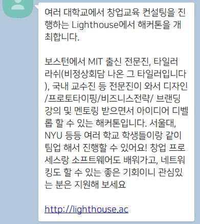 그러나 아쉬운 점을 꼽아보자면 참가했던 창업 캠프에서는 아이템을 중요시해서 2박 3일 혹은 1박 2일간의 창업 캠프 기간 동안 오직 거기에만 몰두해서 진행이 되었었다. 획기적인 아이디어와 혁신적인 아이디어는 생각해내기 어려웠고 어떻게 하면 수상에 조금 더 가까워질 수 있을까? 하는 방식으로 진행이 되었다. 그러다 보니 항상 비슷한 생각들에 머무르게 되었고 창업 캠프 기간 내에서도 오직 그 아이디어를 위했기에 큰 도움을 받았다는 생각은 하지 못하게 되었다. 그런데 지금 이 lighthouse에서 주관했던 해커톤과 워크숍 행사를 다녀오면서 느꼈던 것은 물고기를 잡아다 주는 것이 아닌, 낚시를 하는 법을 알려주는 곳이 바로 lighthouse라는 생각이 들었다. 무엇을 알고 참여를 했던 건 아니고 정말 우연히 내가 소속되어있는 블록체인 관련 채팅방에서 이런 메시지를 보게 되었다.