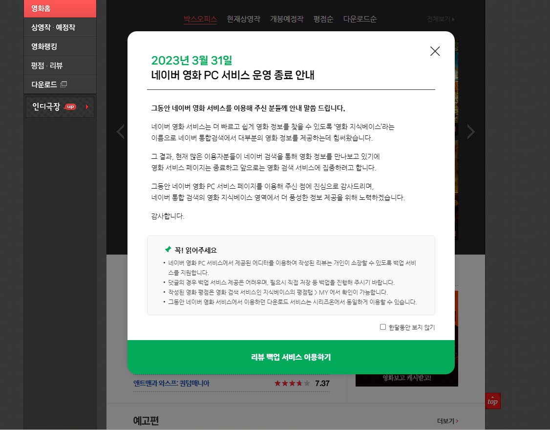 이제 네이버 영화 서비스가 운영 종료되고 영화 검색 서비스에 집중을 한다고 한다.